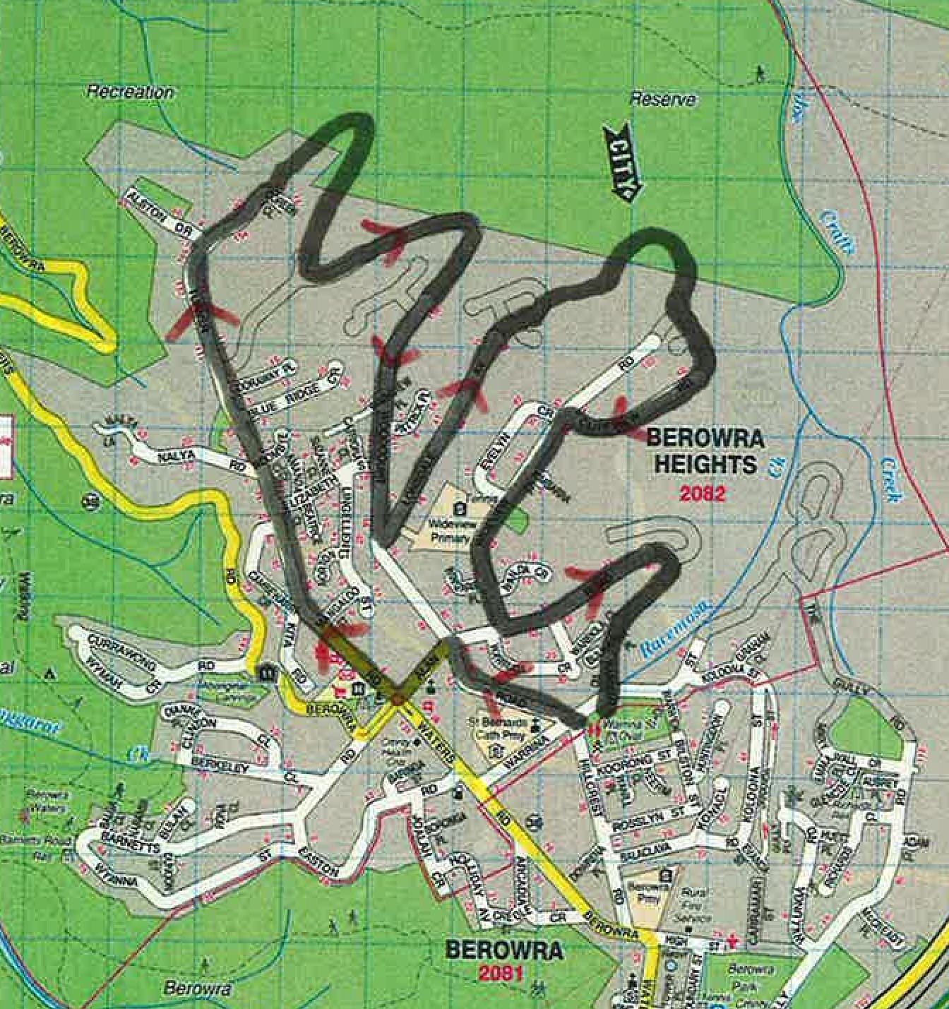 Exit fire trail at end of Warrego Rd (corner of Bulwarra Pl)